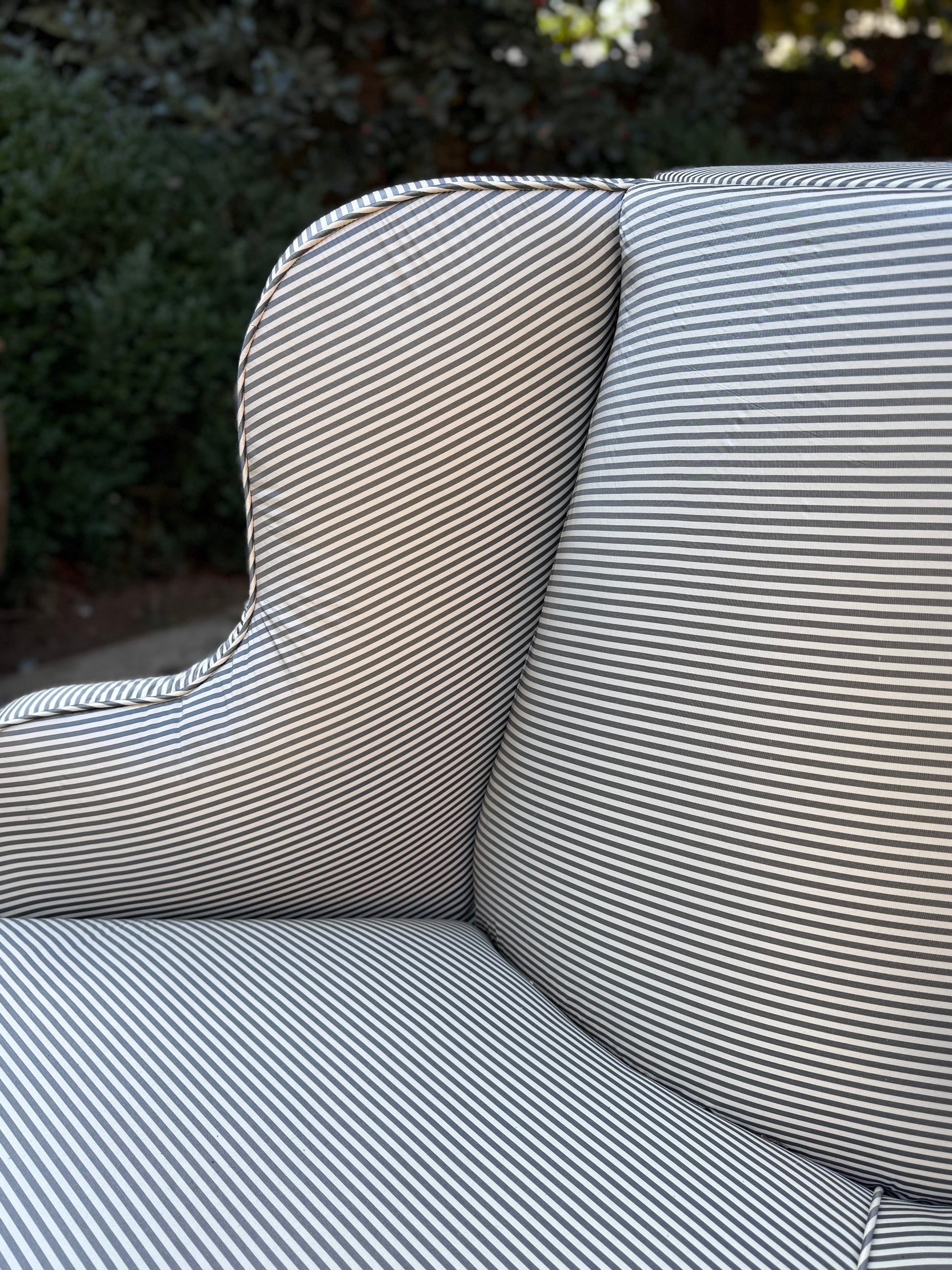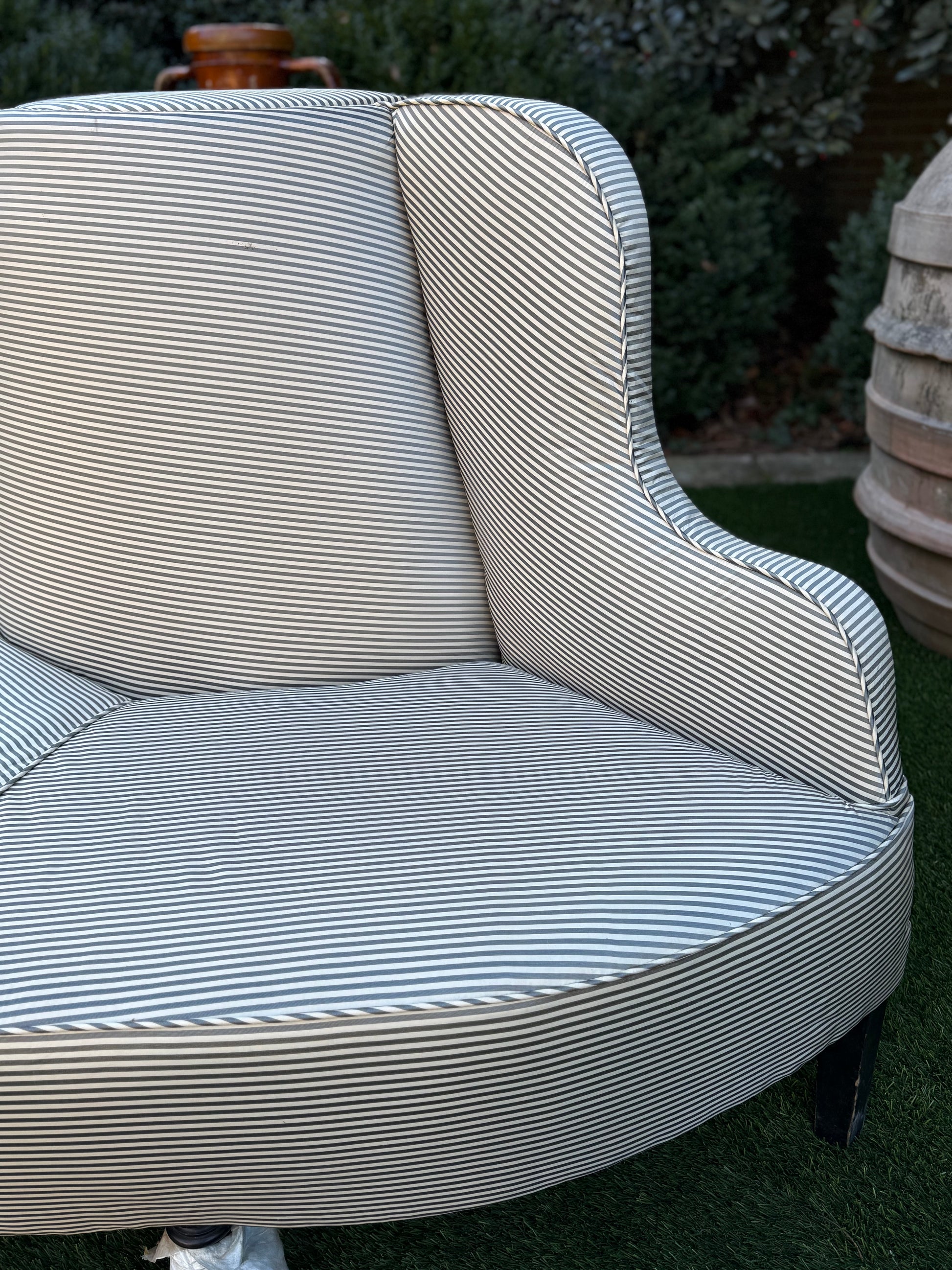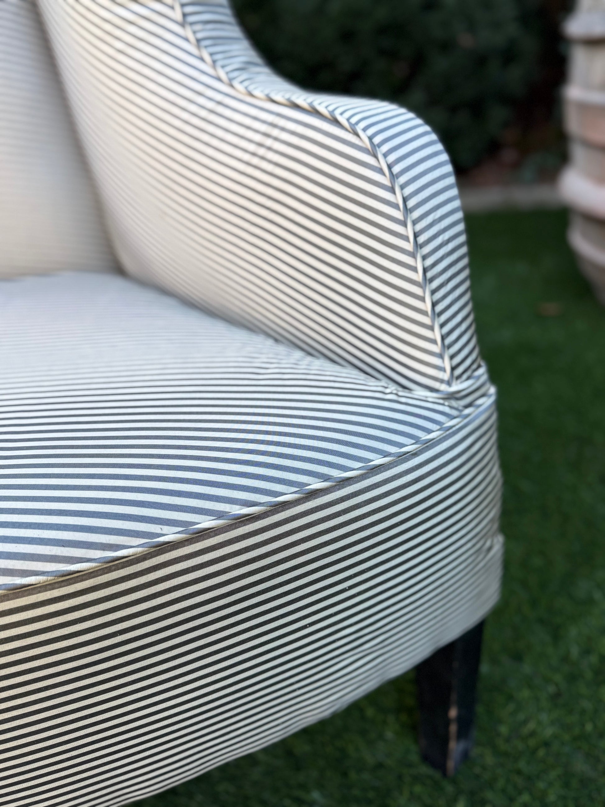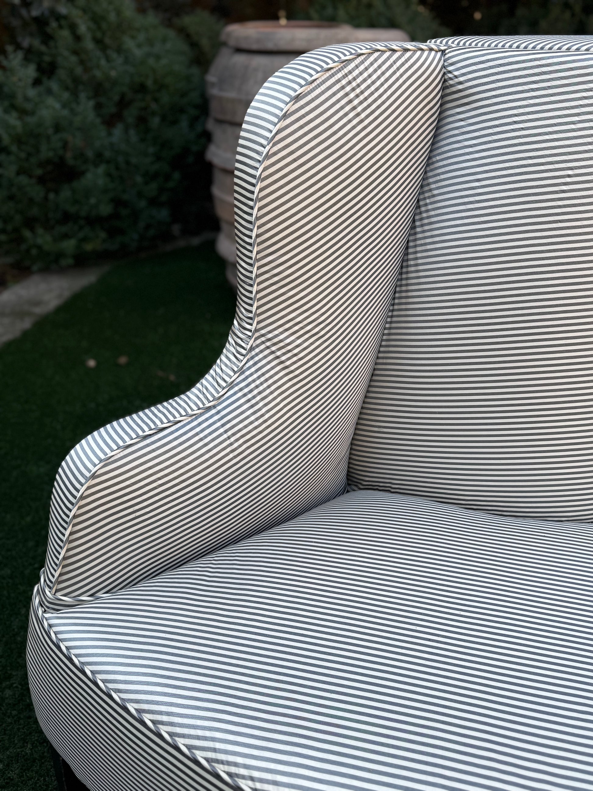 Newly upholstered in a gray silk stripe