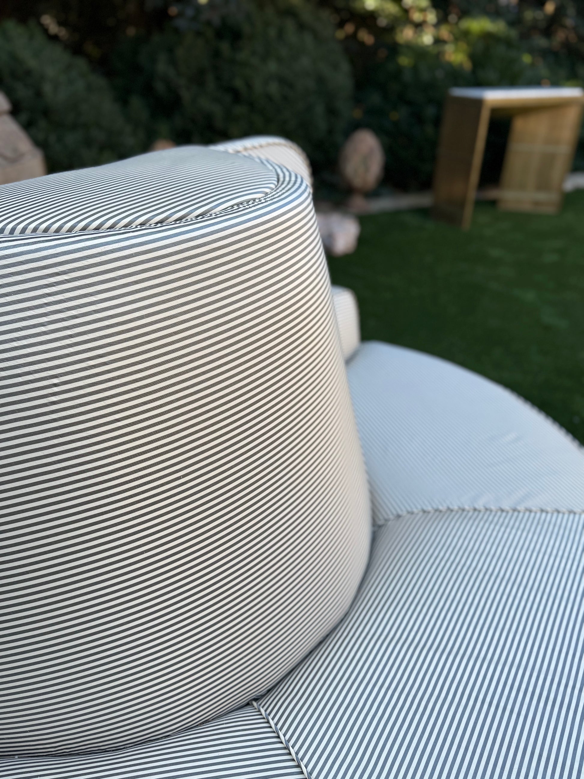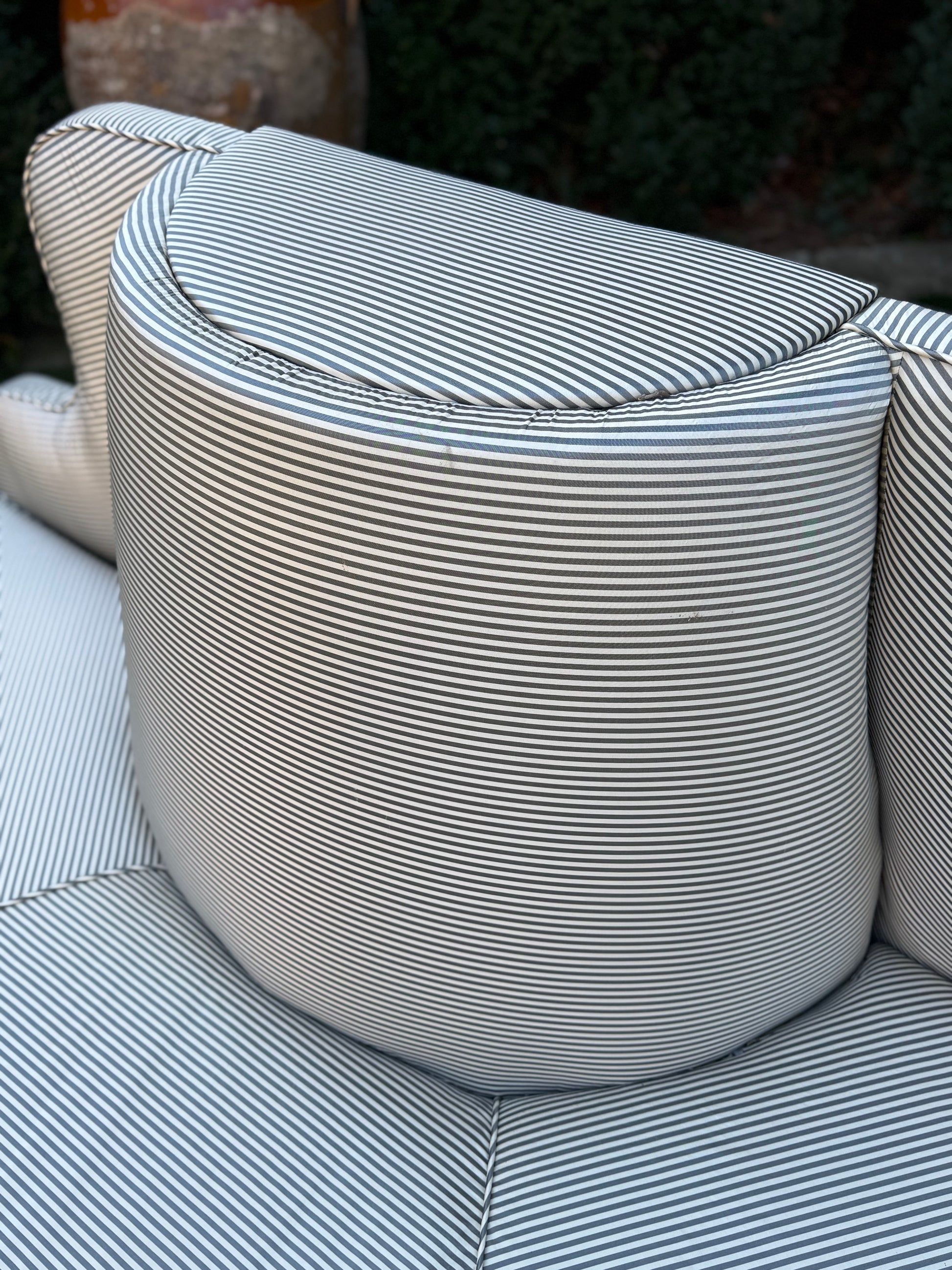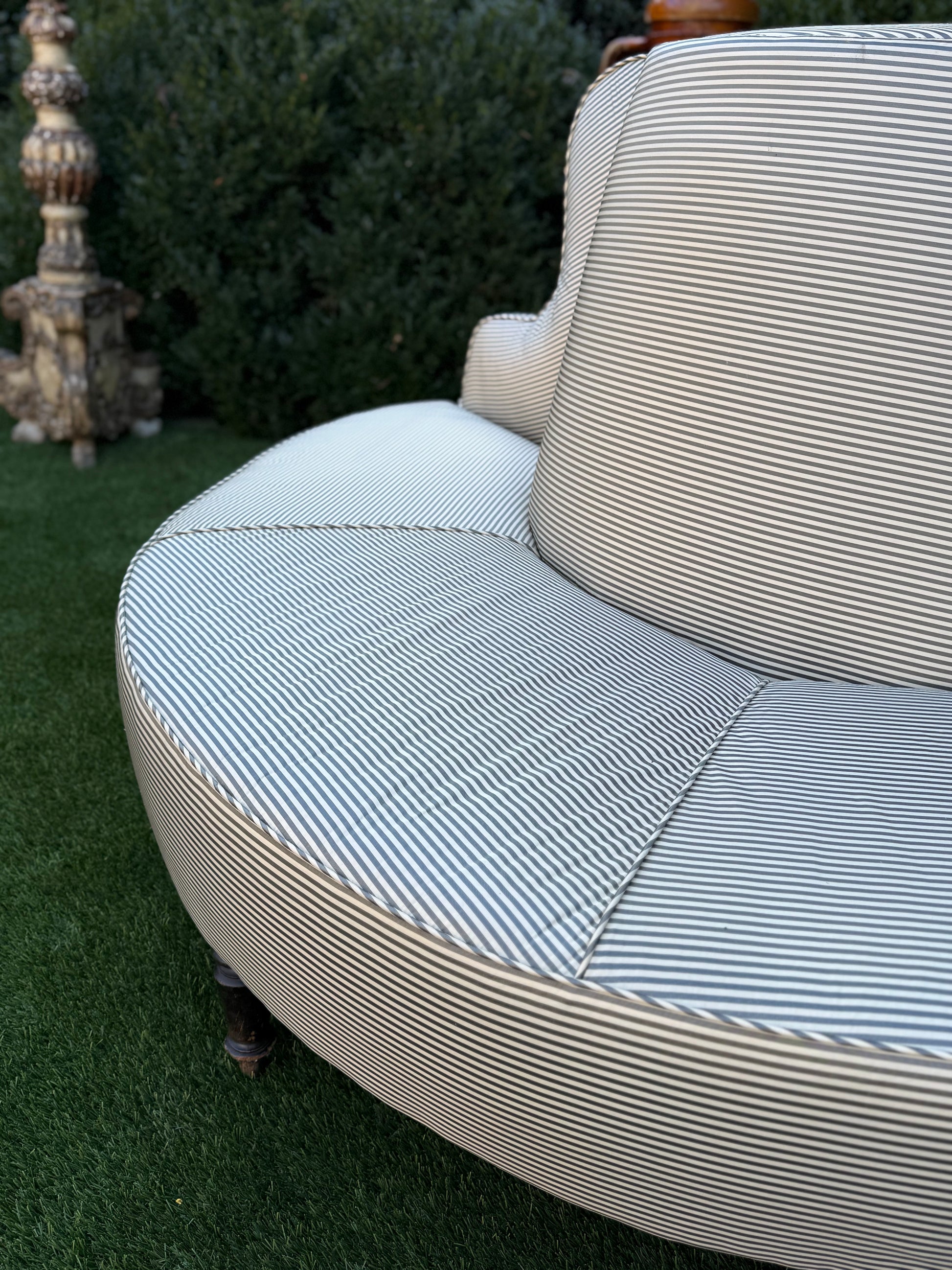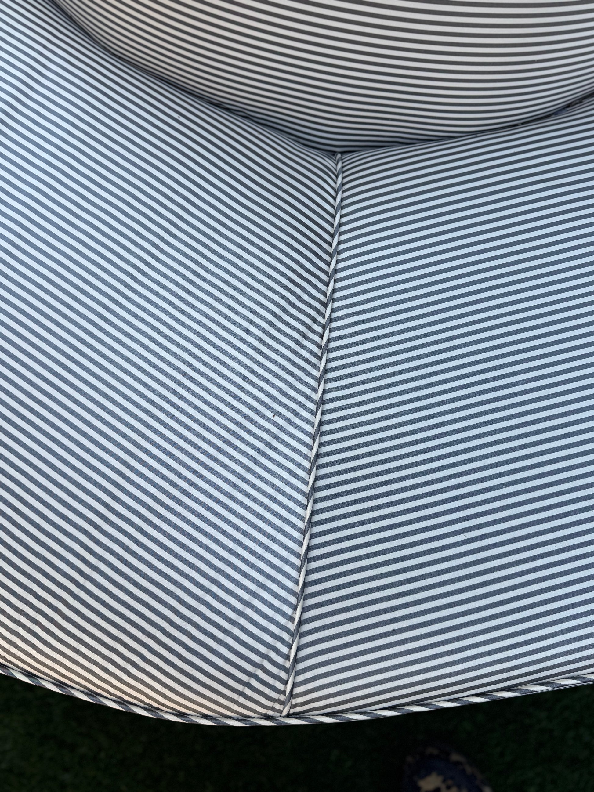 Newly upholstered in a gray silk stripe